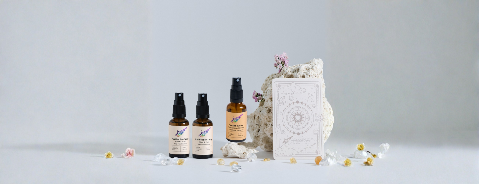 請「先淨化,後招財」,先將環境中的穢氣一掃而空,再使用招財噴霧,來啟動能量。願我們使用這些恩賜時能感謝愛護宇宙天父與大地母親,噴霧所使用的水晶由療癒師先儲存思想, 喚醒內在力量,在淨化後活絡磁場。